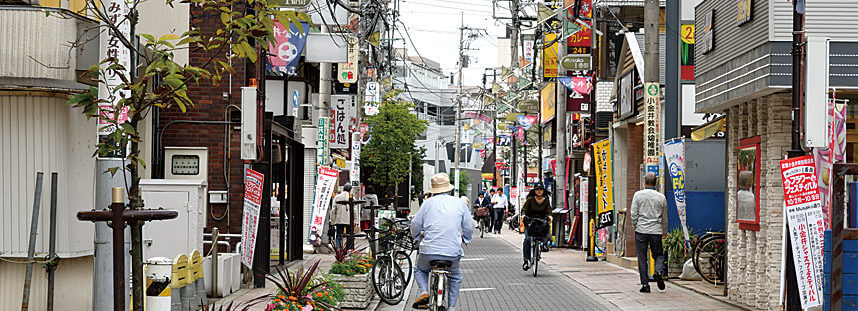武蔵小金井駅南口を出て、線路沿いに東へ続く商店会。かつて蛇の目ミシンの工場が隣接し社員の人たちが多く行き来していたため、レストランや割烹、居酒屋や喫茶店など、今も実力派の飲食店が並んでいる。駅を降りて仕事帰りに立ち寄る人も多く、夜遅くまで賑わう。