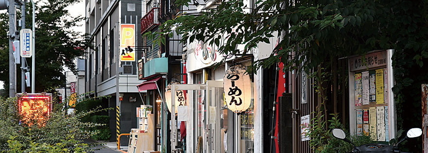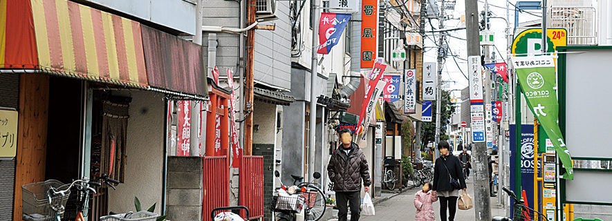 武蔵小金井駅南口を出て、線路沿いに東へ続く商店会。かつて蛇の目ミシンの工場が隣接し社員の人たちが多く行き来していたため、レストランや割烹、居酒屋や喫茶店など、今も実力派の飲食店が並んでいる。駅を降りて仕事帰りに立ち寄る人も多く、夜遅くまで賑わう。